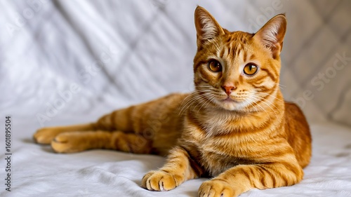 © Ree, Obraz premium Cute orange tabby cat lying on white blanket looking at camera indoors