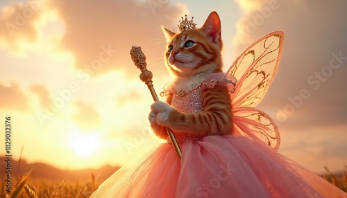 © miss irine, Obraz premium Cute orange tabby cat wears pink fairy princess dress, small crown, delicate wings. Pet holds magic scepter outdoors in golden hour light. Feline looks elegant in costume, standing in sunset field