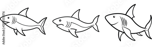 Fototapeta premium Cute Outlined Sharks on White Background, Simple Cartoon Sea Animals Set