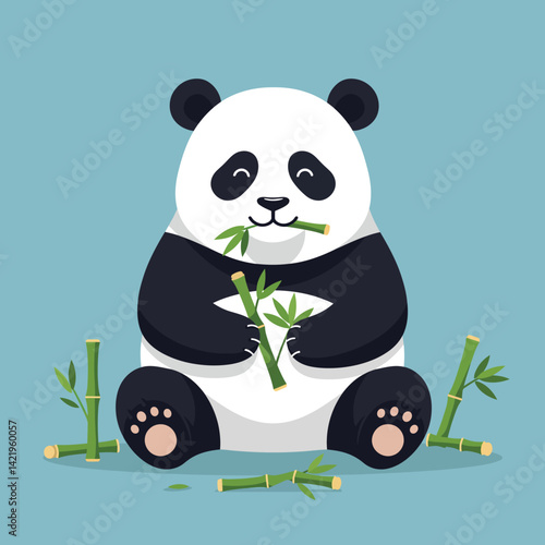 Fototapeta premium Cute panda bear eating bamboo sticks with happy expression on blue background vector illustration