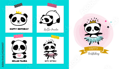 Obraz premium Cute Panda bear illustrations, collection of colorful simple style cards,...