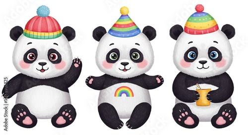 © Heri, Naklejka premium Cute Panda Bears in Party Hats and Winter Hat Illustration