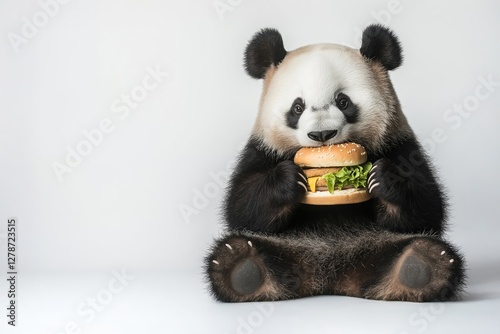© EdvvinStudios, Naklejka premium Cute panda cub enjoying a delicious hamburger in studio setting