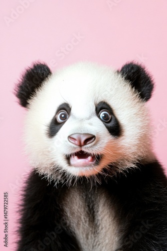 Fototapeta premium Cute Panda Cub Portrait on Pink Background, Close Up, Surprised Expression,...