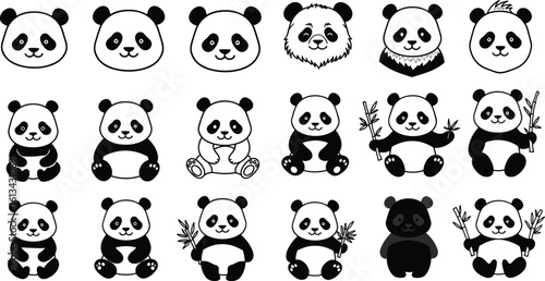 Obraz premium Cute panda illustration set, cartoon panda faces and poses, baby panda with bamboo, vector animal drawings for kids and design