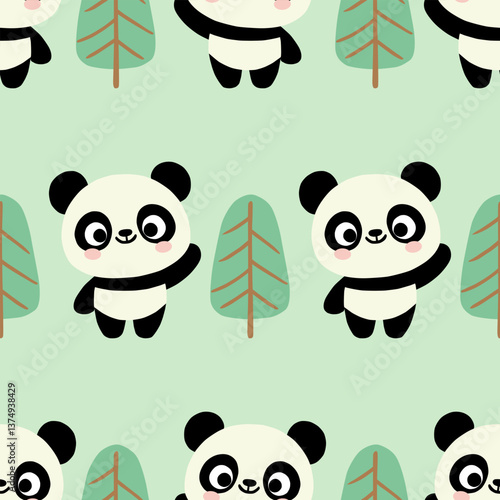 © zeenika, Obraz premium cute panda pattern bear cheering pose mint green seamless background with trees.