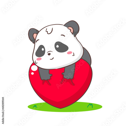 Naklejka premium Cute panda with big love heart. Adorable kawaii animal concept design. Flat cartoon character. Isolated white background. Vector Art illustration