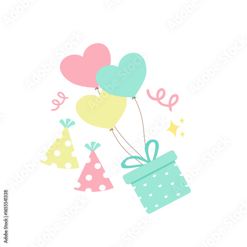 © Hilda Nofianita 🌷, Fototapeta premium Cute Party Vector with Heart Balloons, Gift Box and Party Hats Illustration