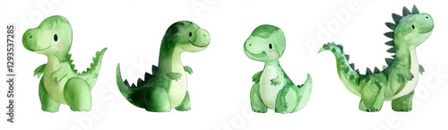 Fototapeta premium Cute pastel colored watercolor dinosaurs in various poses, showcasing their playful expressions and charming features. Perfect for children illustrations or decor