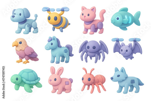Fototapeta premium Cute pastel 3d animal figures for kids: dog, bee, cat, fish, bird, unicorn,...