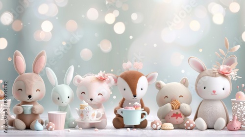 Naklejka premium Cute pastel plush animals having a tea party against a dreamy bokeh...
