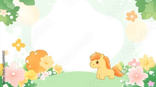 Fototapeta premium Cute pastel pony playfully interacts with lion cub in vibrant spring meadow...