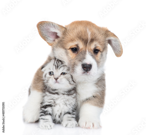 Obraz premium Cute Pembroke welsh corgi puppy embraces tiny kitten. isolated on white background