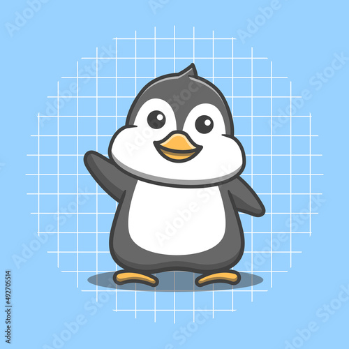 © Supercutecandy, Naklejka premium Cute penguin character waving vector illustration. Flat cartoon style.