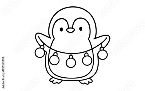 Fototapeta premium Cute penguin holding christmas lights in black and white outline drawing
