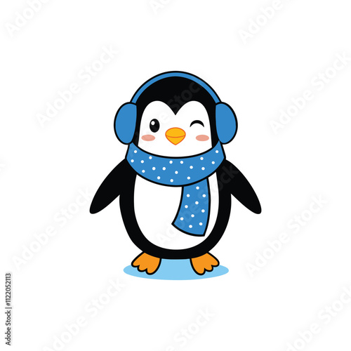 Obraz premium Cute Penguin in Earmuffs and Scarf, Winter Cartoon Vector