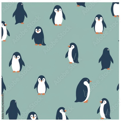 © Qstock, Obraz premium Cute Penguin Pattern Illustration for Kids - Adorable Penguin Design on Teal Background