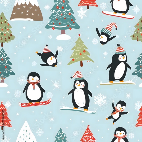 © Sagar, Fototapeta premium cute penguin pattern with a light blue background