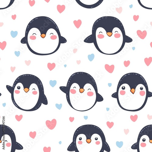 © Tanish, Fototapeta premium Cute Penguin Seamless Pattern with Hearts