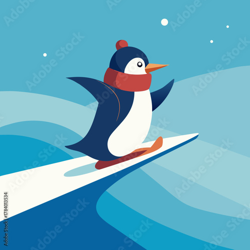 Fototapeta premium Cute penguin surfing on a white wave under a blue sky