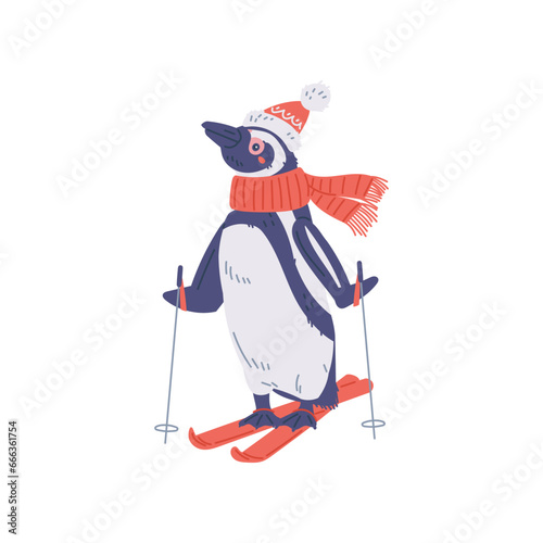 Obraz premium Cute penguin wearing scarf and skiing, vector illustration isolated on white.