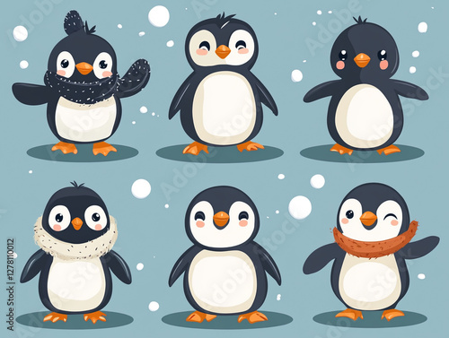 Fototapeta premium Cute penguins in winter attire playfully posing together