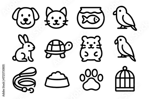 Fototapeta premium Cute pet line art icons featuring animals and accessories