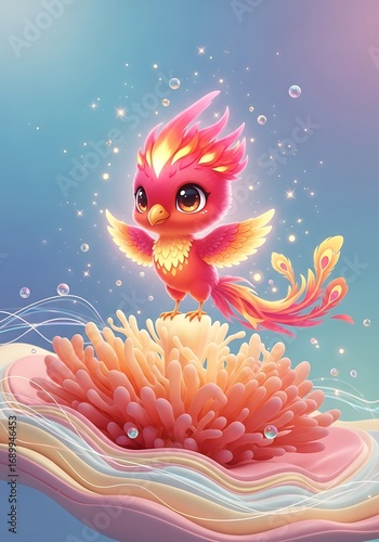 Obraz premium Cute phoenix perched atop fantasy coral, radiating joyful magic around