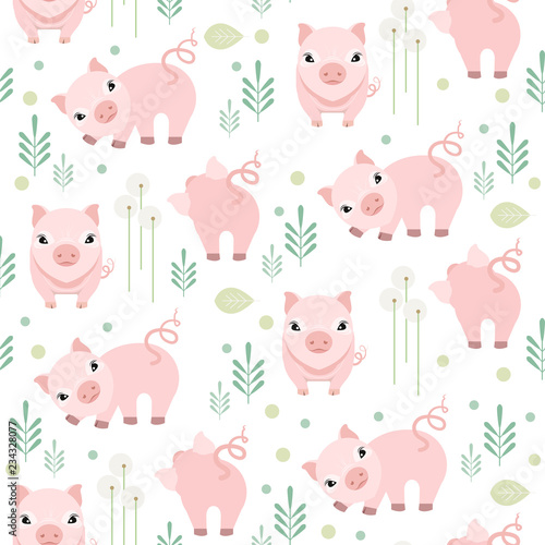 © Dar_ria, Fototapeta premium Cute pig childish seamless pattern on white background. Happy piggy cartoon vector illustration