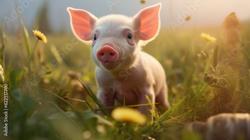 Fototapeta premium Cute pig enjoying the green grass in a farm field