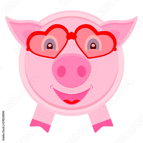 © Siarhei, Naklejka premium Cute pig in glasses with hearts. Vector cartoon illustration. Clipart and drawing on white background.