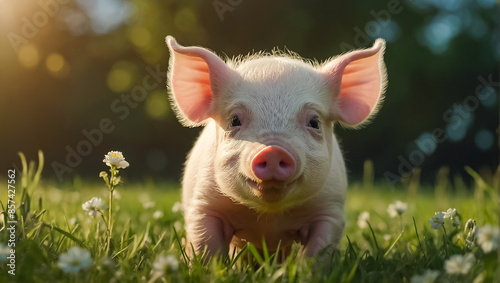 © tanya78, Fototapeta premium Cute pig on the lawn in summer