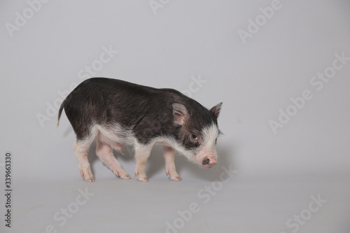 Fototapeta premium Cute pink, black mini pig stands on a white background