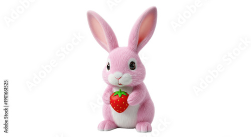 Obraz premium Cute pink bunny holding strawberry isolated on transparent background
