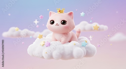 Obraz premium Cute Pink Cartoon Cat with Crown Sitting on a Fluffy Cloud