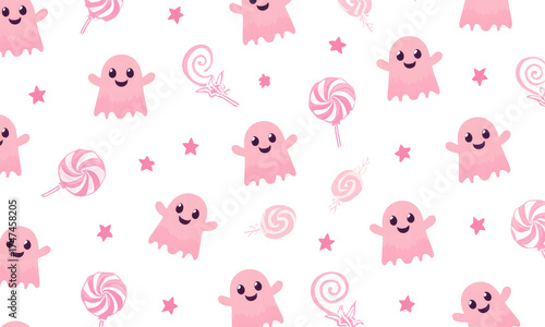Fototapeta premium Cute Pink Ghosts and Lollipops Seamless Pattern Background