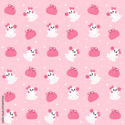 Fototapeta premium Cute Pink Halloween Seamless Pattern with Kawaii Ghosts and Pumpkins on soft pink background with sparkles. Ideal for children's products, textiles, packaging, and decorative materials for Halloween