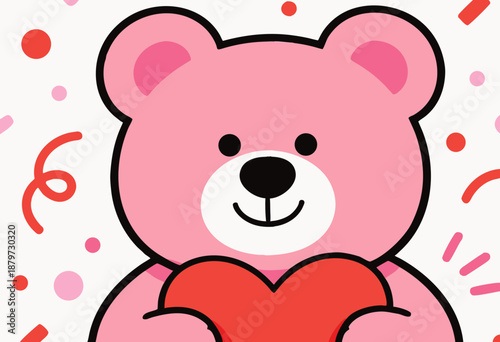 Obraz premium cute pink teddy bear holding red heart surrounded by colorful confetti