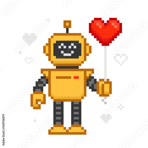 Fototapeta premium Cute pixel robot holding heart balloon in retro video game style. Geek...