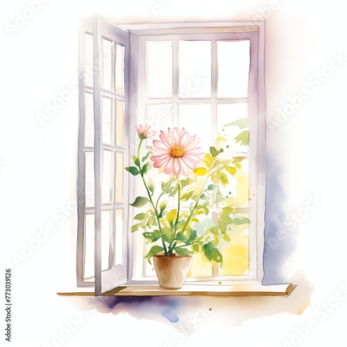 © Minimal Blue, Fototapeta premium Cute plant in front of a window scene in watercolor illustration