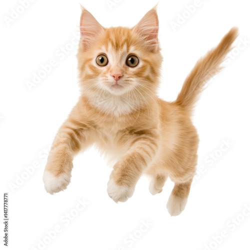 © Watcharaporn, Obraz premium Cute playful orange tabby kitten with big eyes and fluffy tail jumping isolated on white background in vibrant energetic pose