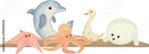 Naklejka premium Cute plush toy set — dolphin, seal, octopus, duck, and starfish in pastel...