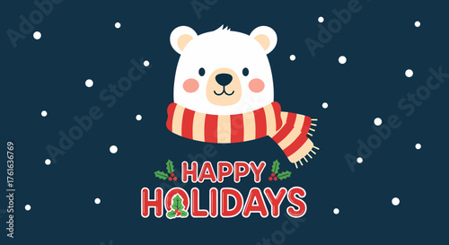 Fototapeta premium Cute polar bear wearing a scarf wishing happy holidays.