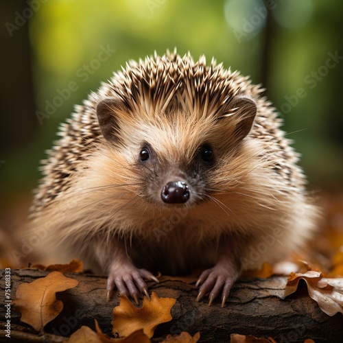 © aulia, Fototapeta premium cute portrait of a hedgehog standing on a fallen tree with a tropical forest background.auto focus portrait