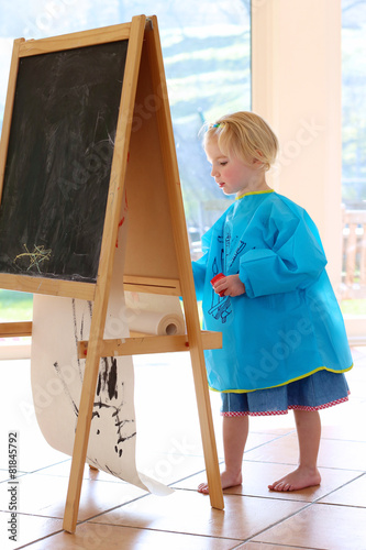 Obraz premium Cute preschooler girl drawing or painting indoors
