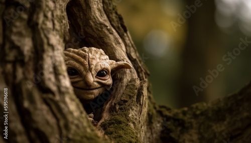 © Stockgiu, Fototapeta premium Cute primate hiding on tree trunk branch generated by AI