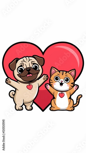 © Marek49, Obraz premium Cute Pug and Cat with Love Shape Cartoon Icon Generative AI