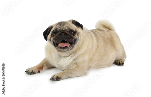 Obraz premium Cute pug dog lying in a studio