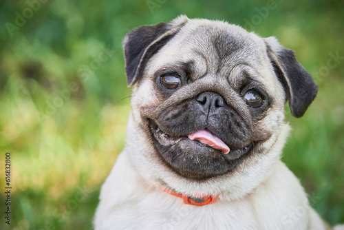 © Laima Gri, Obraz premium Cute pug dog portrait on green grass background