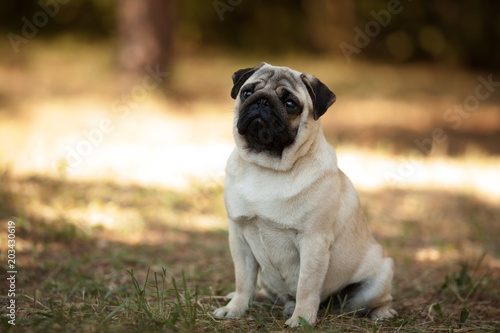 © serova_ekaterina, Obraz premium cute pug dog sitting on the grass glare of the sun in the background